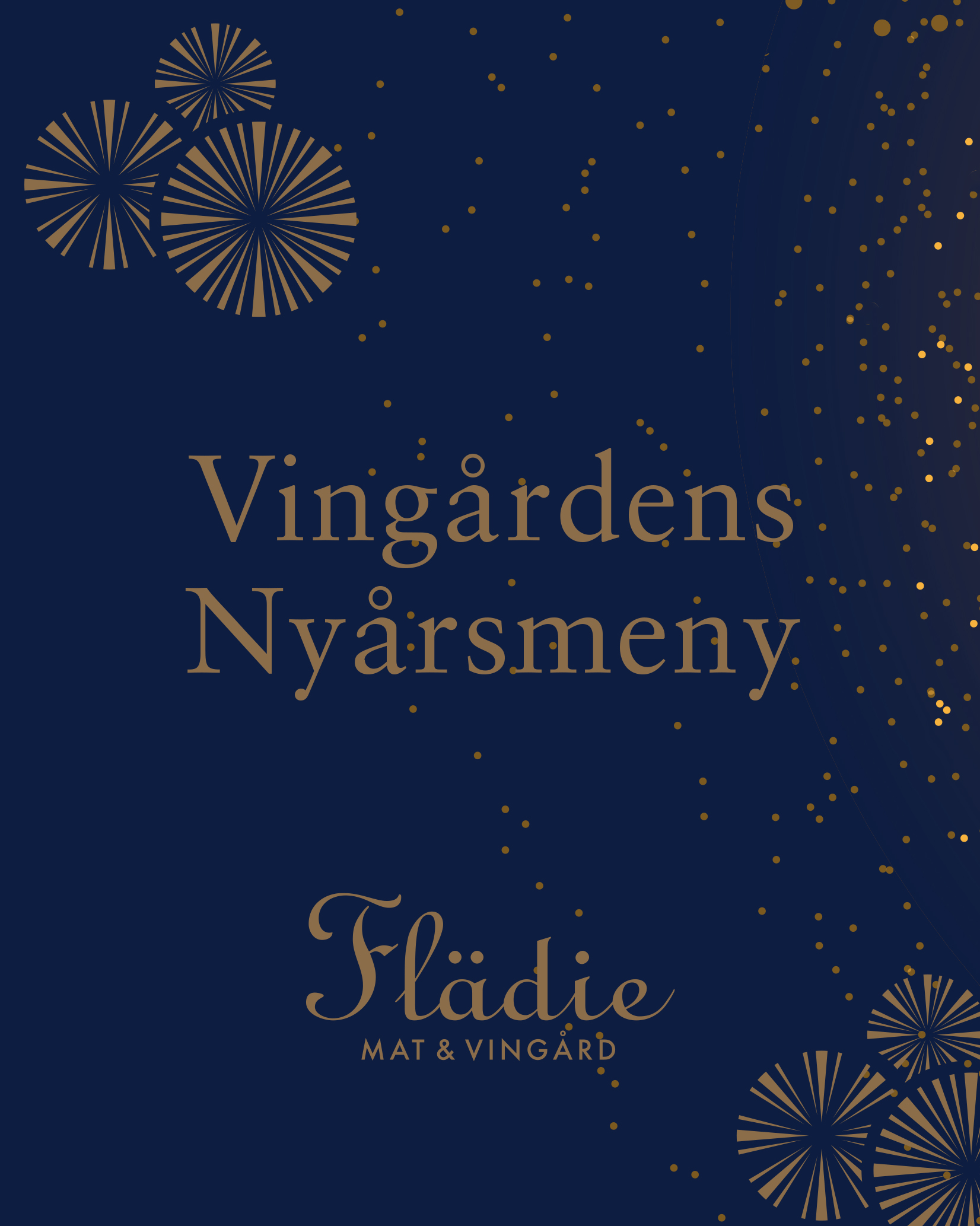 16 december är sista chansen för i år att njuta av vingårdens härliga julkalas som vi har serverat under december. Vi erbjuder en middag i fyra serveringar med vår tolkning av julens klassiska smaker där skånskt vilt, närodlat och grönt står i fokus. I priset ingår även gottebord – allt detta i den underbara juliga inramningen av vår rofyllda, unika skånska vingårdsmiljö. Pris 895 kr / 799 kr exkl. moms Lilla dryckespaketet 295 kr / 196 kr exkl. moms Stora dryckespaketet 650 kr / 496 kr exkl. moms Helgen 19-20 december serverar vi vår trerättersmeny inspirerad av julens smaker. För lite större sällskap erbjuder vi den hela december fram till jul. Menyn kostar 665 kr / 593 kr exkl. moms Det finns möjlighet att sitta avskilt i någon av våra festlokaler. Då tillkommer kostnad för lokalen. Kontakta oss gärna för en offert och en diskussion om hur just er julfest skulle kunna utformas hos oss! Pris 3.500 kr för två i delat dubbelrum För avhämtning nyårsafton kl 11-13. Eldad Färölax, glasgurka, päron, rökt forellrom, yuzomajonnäs, alger, crisp, krämigt skum på svenska grönärtan Ebba. Rosastekt dovhjort, ochiki kuri på två vis, plommon och svartbönchutney, timutpepparsky, grönkålschips, rotfruktsterrin. Skogsbär, dulce de leche, chokladterrin, syrad grädde, lingongel, brynt vit choklad, sockerflarn 545 krJulkalas på Flädie Mat & Vingård